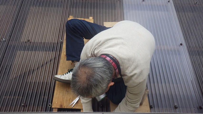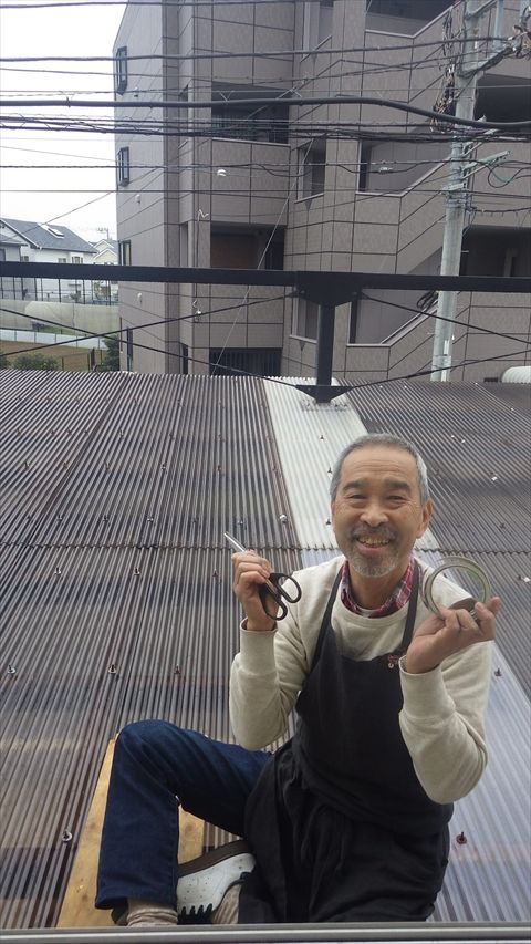 雨どいの補修をしているマスターを激写!