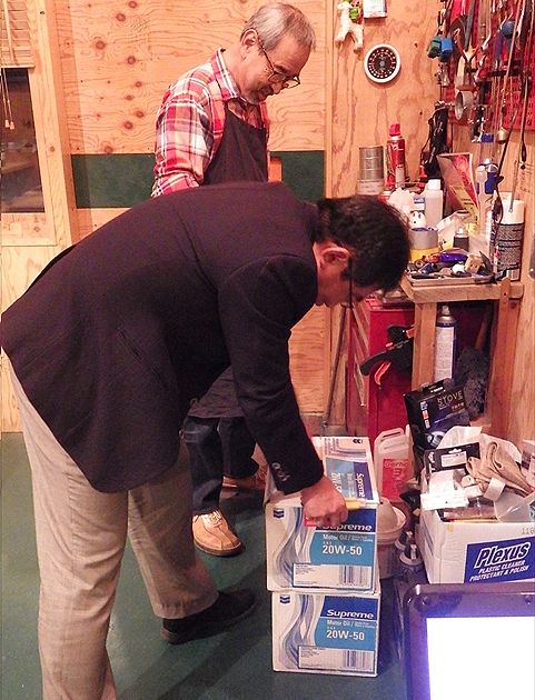 オイルの箱を開けています・・・オートバイ屋みたい!