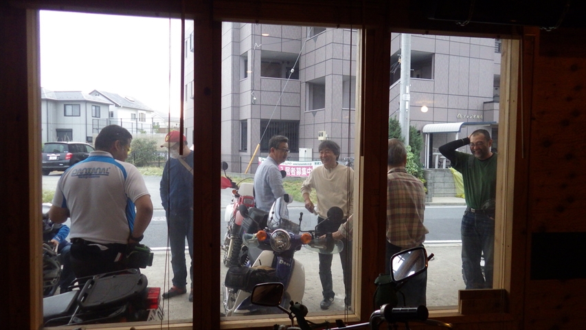 CB750でツーリング帰りのH君入扉。