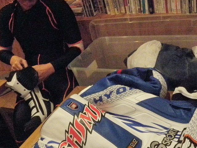 レース場では、お互いさまでつなぎの着たり脱いだりをやりっこしているとか。