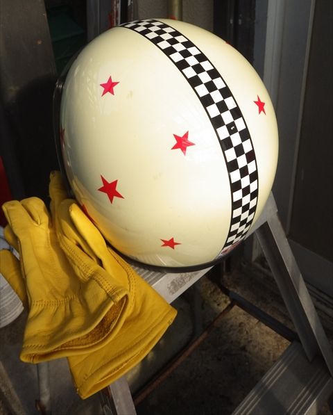 駐車場の脚立にヘルメット&グローブ☆nice(^^)